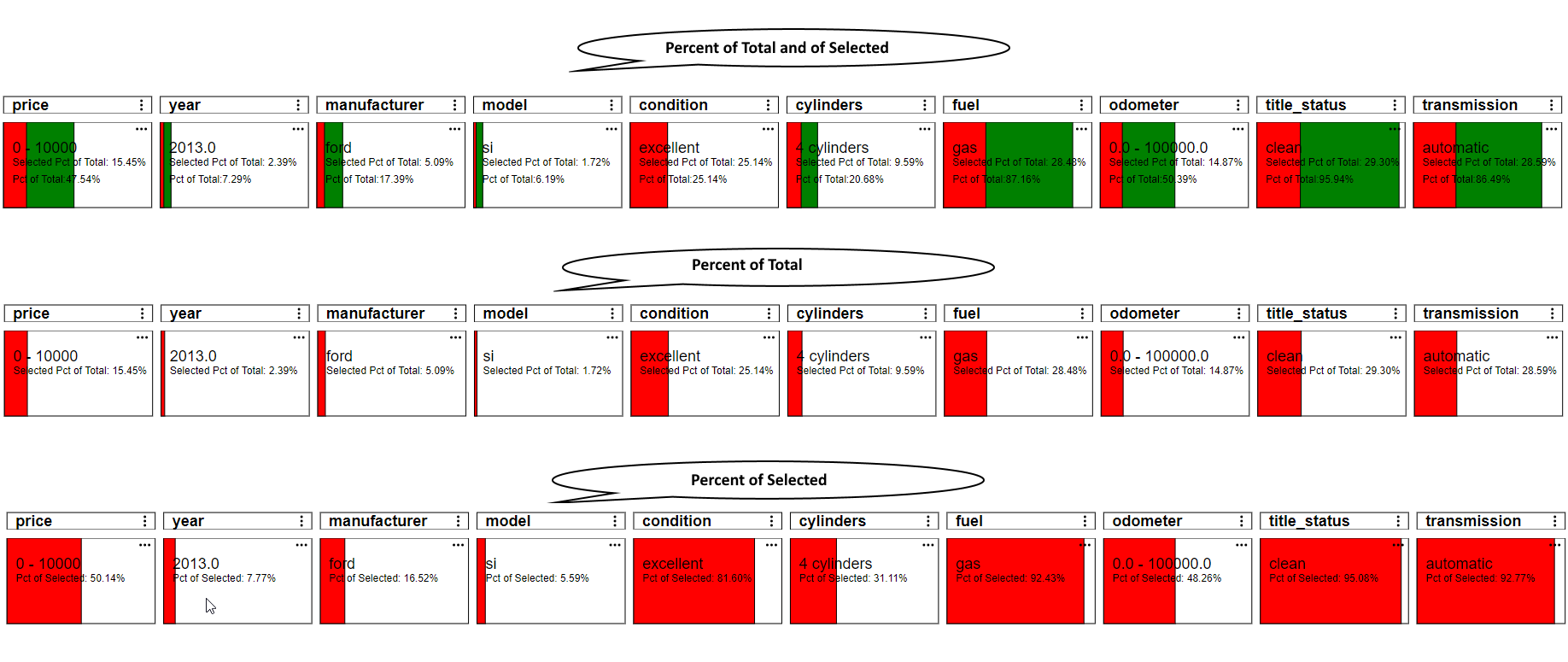 1. Percent of Total and of Selected - This show the total percent of the rows for this cell (group) in green and currently selected percent of the rows in red.