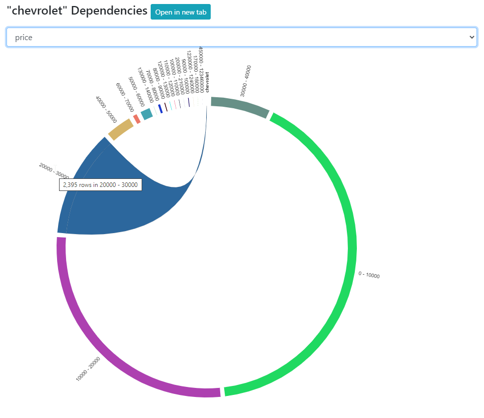 This will display a chord diagram of the rows in this cell and how they relate to a selected columns cells. This allows you to visually inspect significant relationships between cells across columns. Select different columns from the drop-down to chnage the selected view. Hover over individual "chords" to focus in on that relationship