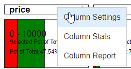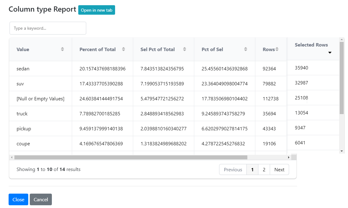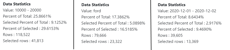 • Percent of Total - the percentage of rows of this value in the column