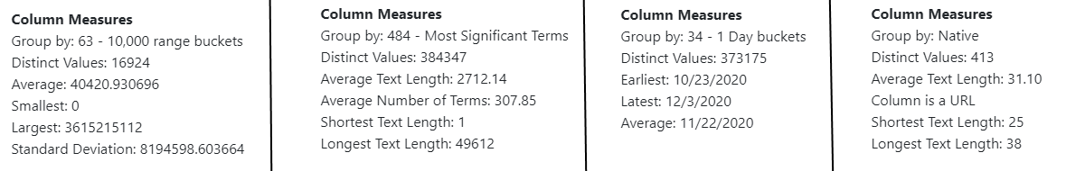 • Distinct Considered Terms Stats - statistics on the distinct terms used per cell across all rows removing common(stop) words