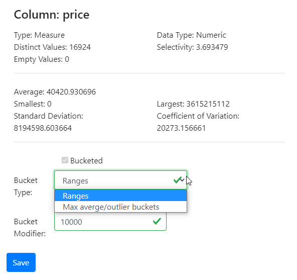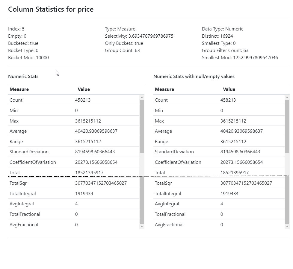• Numeric Stats with null/empty values - the numeric metrics on the column across all rows but treating null and empty values as zero