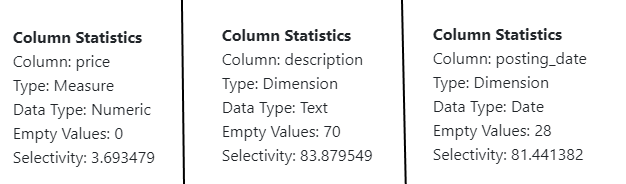 • Numeric Stats - the numeric metrics on the column across all rows but exluding null or empty values