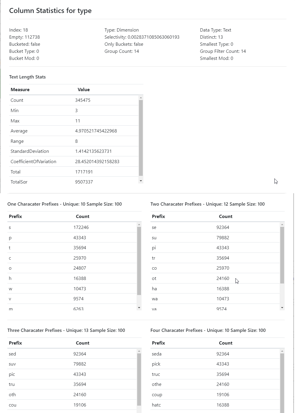 • Four Character Prefixes - shows the top four character prefixes and counts for each