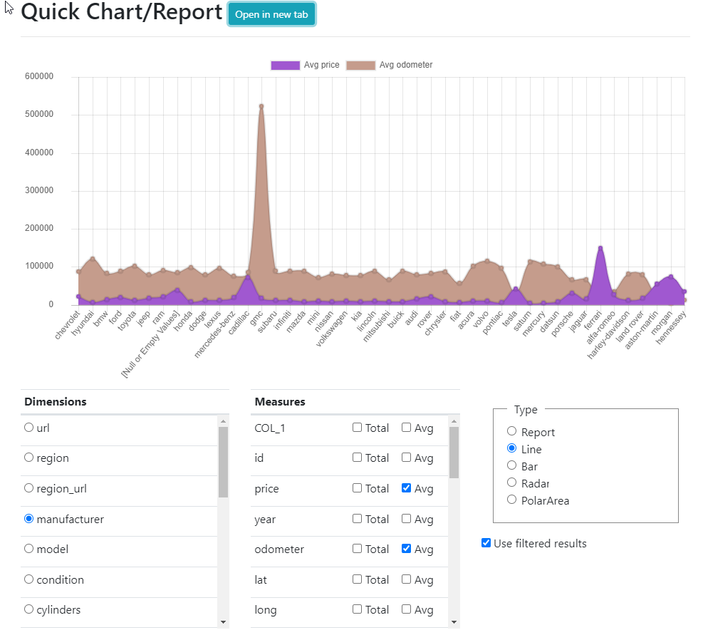 Demonstrates the creation of a line chart showing average price and odometer reading for each manufacturer