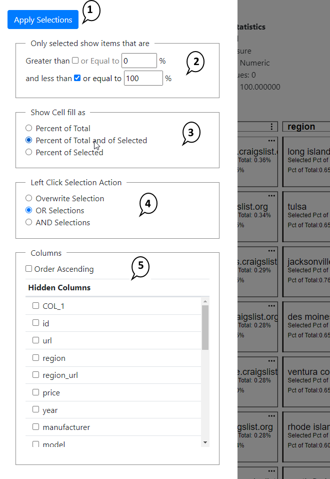 3. Percent of Selected - This shows the percentage of the total filtered rows for this filtered cell (group) in red.