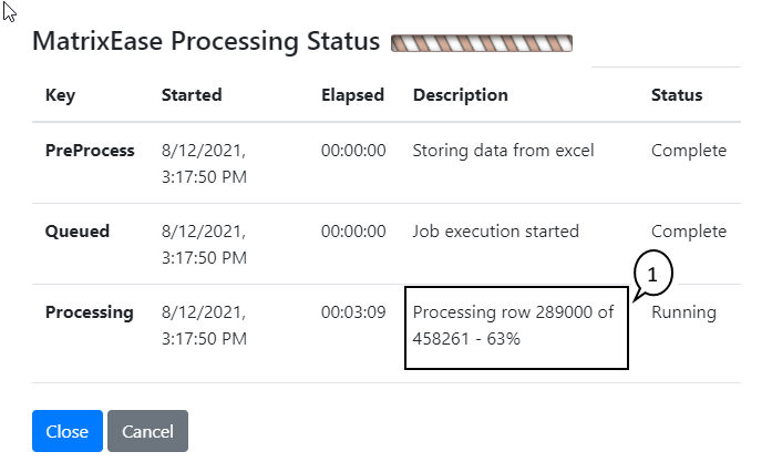 1. Processing - status update on loading the matrix by row and percentage complete.