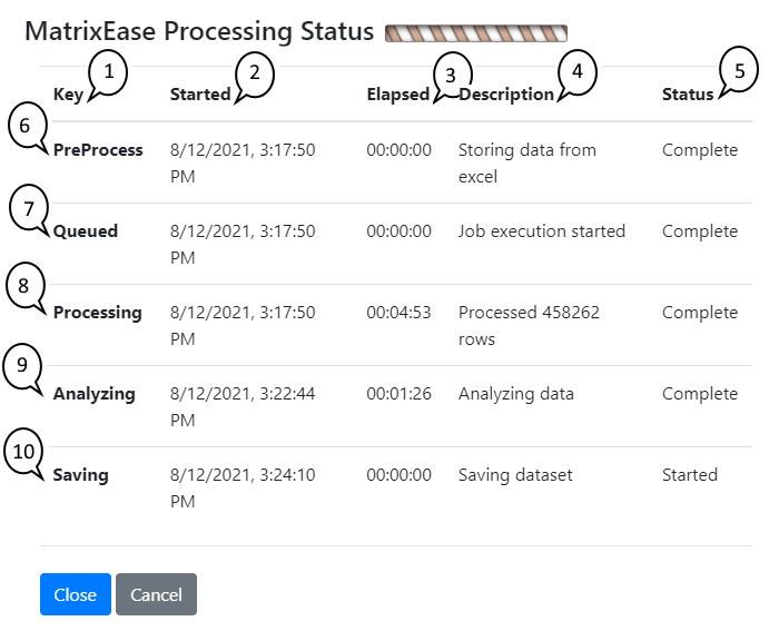 5. Status - the status of this stage in processing - Started, Running, Complete, Failed